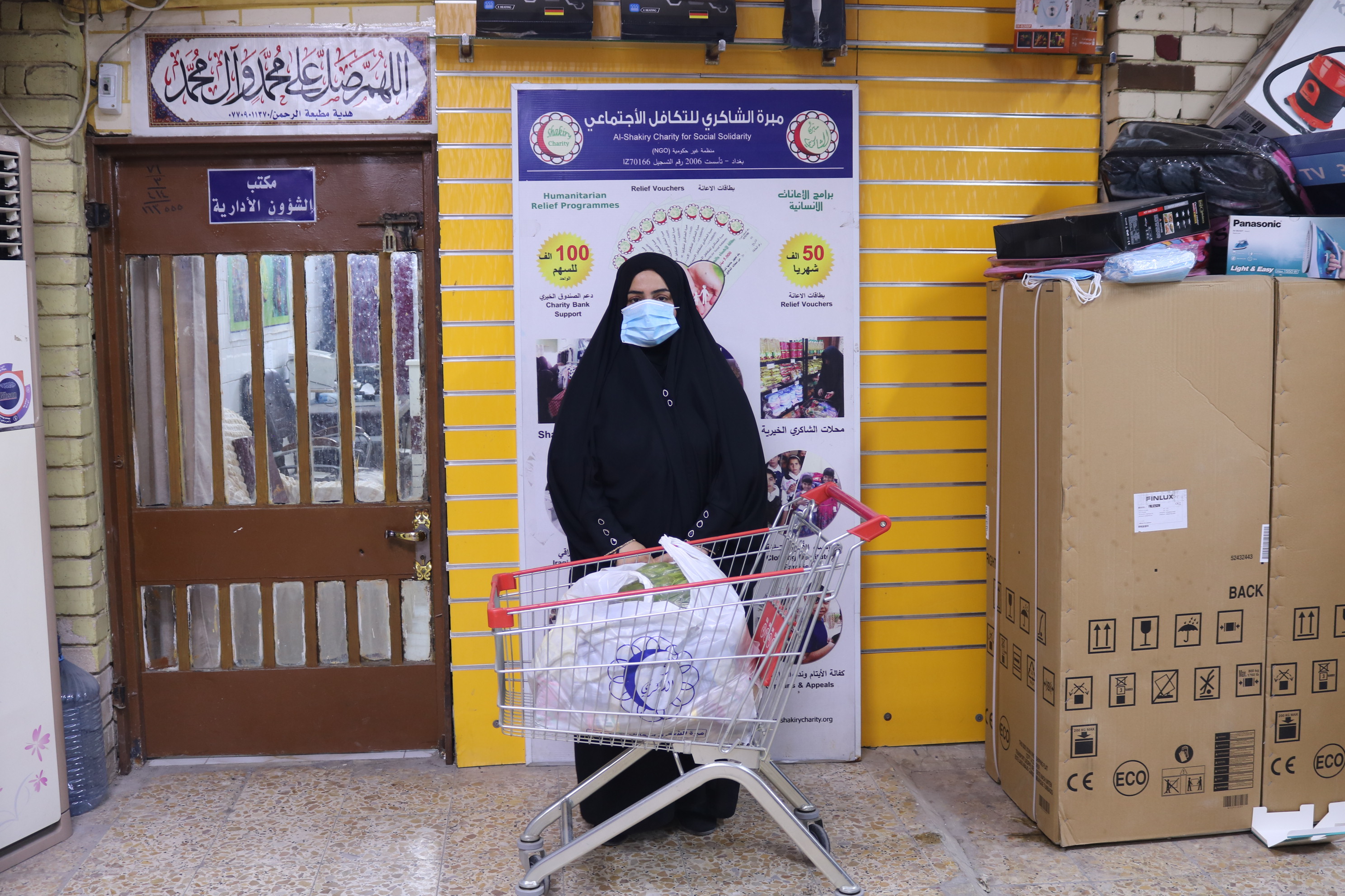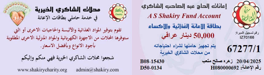 تسليم السيدة المتعففه ( زهره . ص . م ) بطاقة الغذاء والاكساء والمستلزمات الاخرى البالغ قيمتها (50)الف.د.ع مقدم من قبل المتبرع الحاج / عبد الصاحب الشاكري .