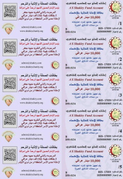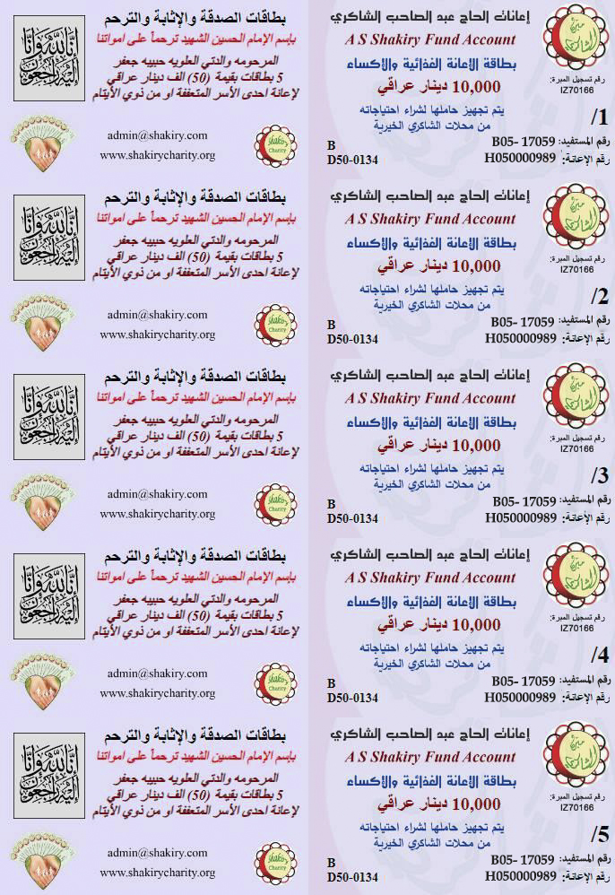 تبرع الحاج / عبد الصاحب الشاكري ببطاقات الاثابه والترحم على روح المرحومه الحاجه العلويه / حبيبه جعفر بمبلغ وقدره (50) الف دينار عراقي الى اسره المتعففه ( ماجده . ا . ج ) , و ذلك لاعانه اسرتها , وابدت السيده رغبتها في شراء ( مواد منزليه ) تم توفيره عن طريق محلات الشاكري الخيريه .