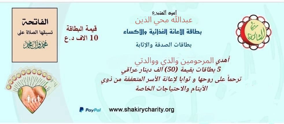 مساعده مالية للارمله (نهايه, ع) من المتبرع (عبد الله محي الدين),بقيمة (50) الف دينار عراقي عن قيمة (5) بطاقات للصدقة والاثابة والترحم ثواباً وترحماً على المرحومين والديه بعدها تم الاتصال بالاسروحضورها للفرع وتامين (سله غذائية ) , يعد هذا العمل الانساني تفعيلاً لبرنامج توفير المستلزمات الضرورية للأسرة المتعففة عبر محلات الشاكري الخيرية