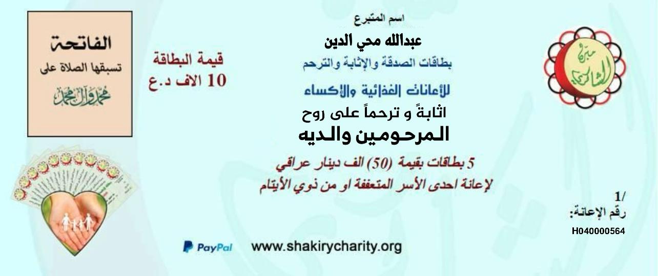 تم تسليم التبرع المقدم من الاستاذ / عبدالله محي الدين والذي يبلغ (50) الف دينار عراقي قيمة خمسة بطاقات للاثابة والترحم على روح المرحومين والديه ، الى الارملة ( بشرى ، ص، ر ) حيث تم تجهيزها بسلة غذائية من محلات الشاكري الخيرية .