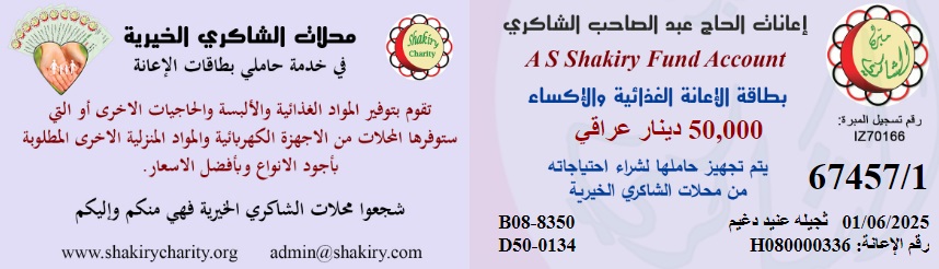 قام كادر الفرع بتسليم اسرة السيدة المتعففه ( ثجيله . ع . د ) بطاقة الغذاء والاكساء والمستلزمات الاخرى البالغ قيمتها (50)الف.د.ع. المقدمة من قبل الحاج الكريم / عبد الصاحب الشاكري. لاعانة الاسرة في احتياجاتها الضرورية .