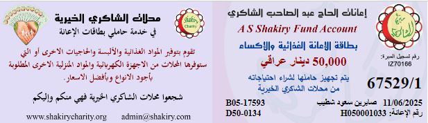 تم تسليم التبرع الوارد من قبل الحاج / عبد الصاحب الشاكري والتي بلغت (50) الف دينار عراقي لاسرة المتعففه ( صابرين . س. ش) وذلك عن توفير اهم احتياجاتها , وابدت السيده رغبتها ي الحصول على ( سله غذائيه ) تم توفيرها عن طريق محلات الشاكري الخيريه .