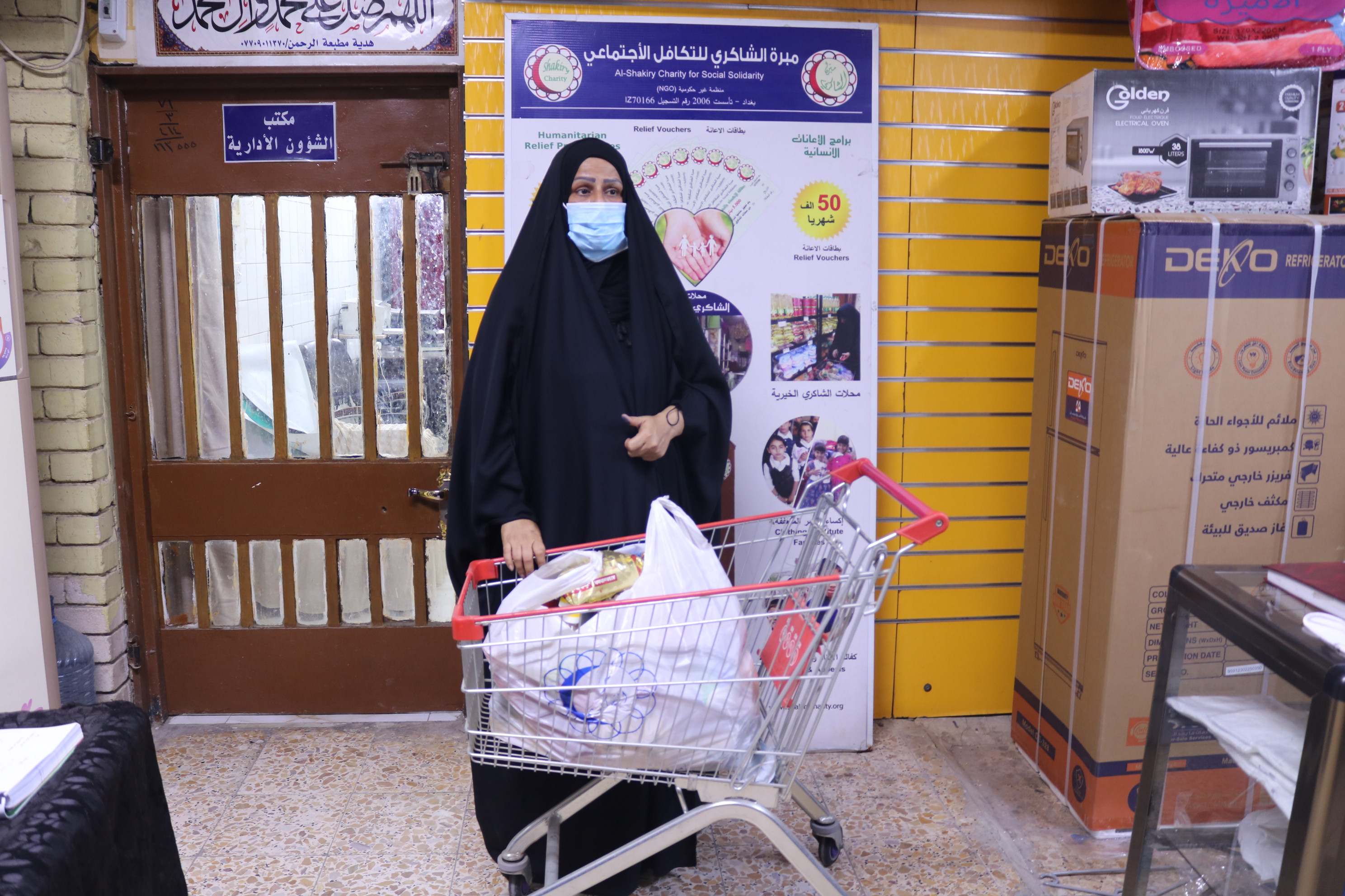 بعد الاستلام تم تجهيز المتعففه بالمواد الغذائية حسب رغبتها من محلات الشاكري الخيريه .