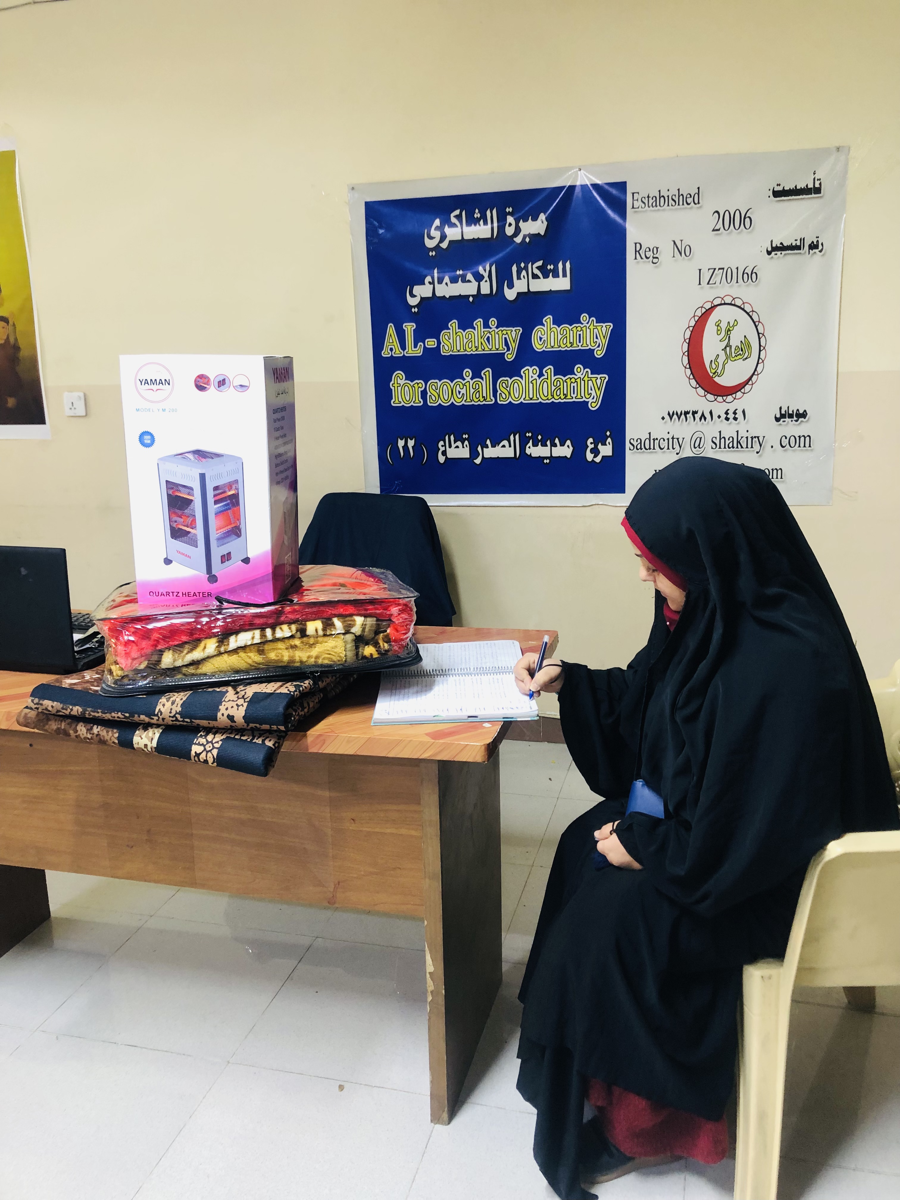 الى أسرة المتعففة/ (سعاد ر. ج.)، وبعد الإتصال بهم وحضورهم رغبوا بالحصول على "مستلزمات منزلية شتوية" من "محلات الشاكري الخيرية".