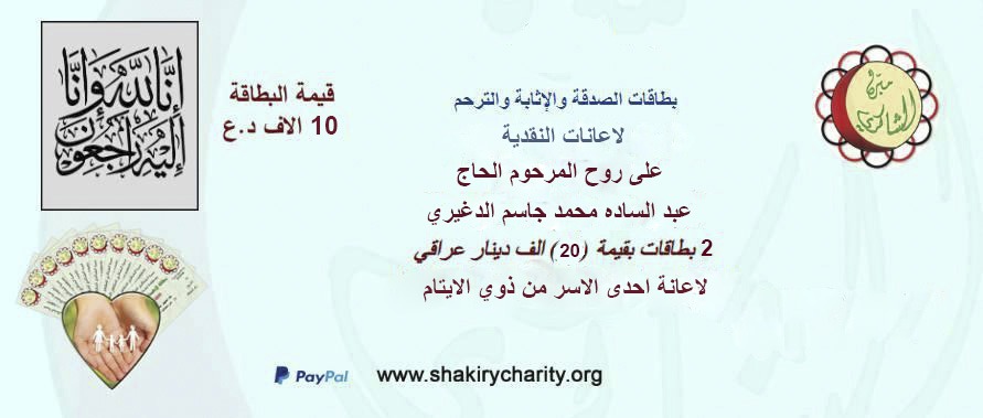 تبرعت اسره المرحوم الحاج / عبد الساده محمد جاسم الدغيري بمبلغ وقدره (2) مليون دينار عراقي ، اثابة الى روح المرحوم الحاج / عبد الساده محمد جاسم الدغيري ثوابا وترحما لروحه الطاهرة .