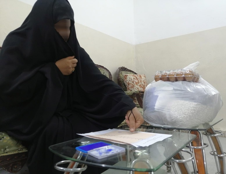 لأسرة السيدة المتعففة/ (نضال ع. أ.) بطاقة الغذاء والإكساء والمستلزمات الأخرى، لإعانة الأسرة في توفير احتياجاتهم الضرورية.