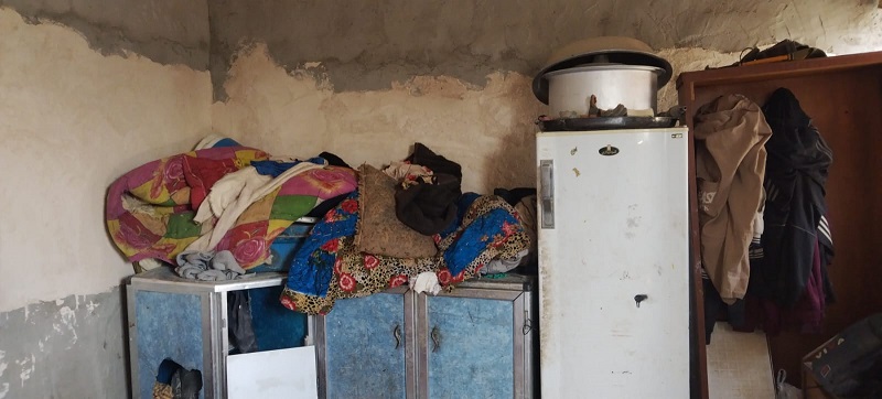 The roof of the house is dilapidated, forcing the family to lay plastic mattresses to prevent rain from entering the house. This family lacks many necessities that the head of the family cannot provide.